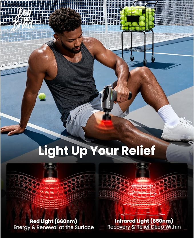 - Unlock Profound 4-in-1 Relief with Red Light, Heat & Deep Percussion: This percussion massage gun fuses four powerful therapies: therapeutic 660nm Red Light & 880nm Near-Infrared, muscle-relaxing thermal heat (104°F to 113°F), and intense deep tissue percussion (10.5mm amplitude). This synergistic, multi-targeted approach penetrates far beneath the surface, effectively addressing the root cause of chronic stiffness and post-workout soreness for superior recovery compared to standard devices.