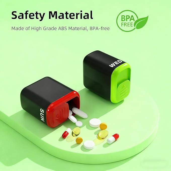 - Durable & Easy to Clean Materials Made from durable ABS plastic and silicone, this pill organizer is designed for everyday use. The smooth surface helps prevent residue buildup and allows for quick, easy cleaning.
