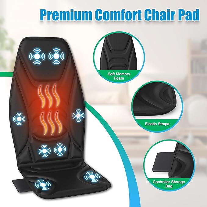 Portable Back Massager with Heat & Vibration - Deep Tissue Pain Relief for Shoulder, Back, Lower Back and Thighs - Office Chair Massage Pad, Ideal Gift for Men and Women