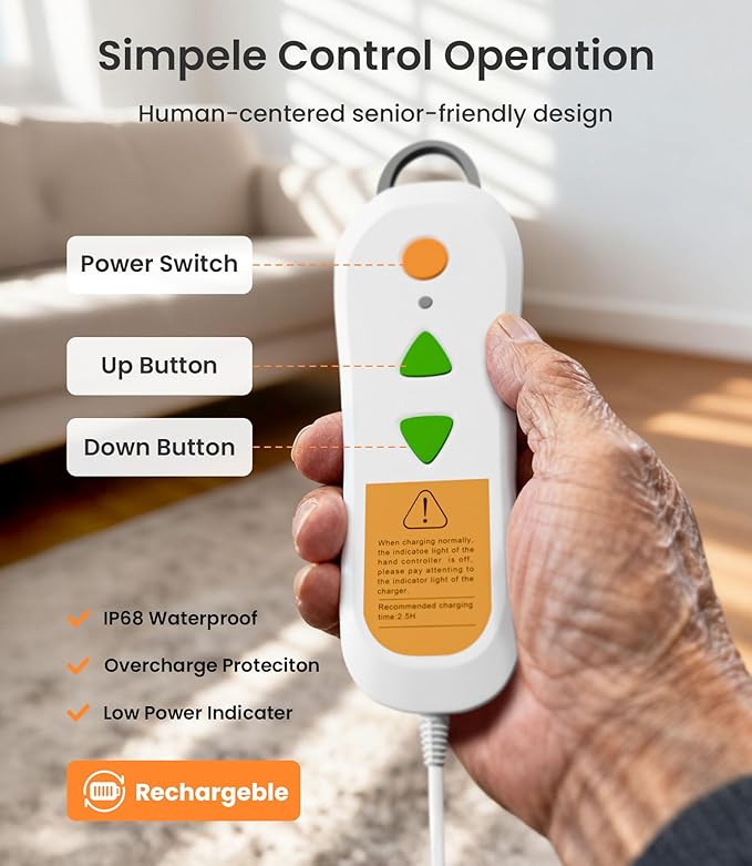 - [Intuitive Cordless Control for Independent Use] - Built to boost seniors’ self-reliance: the lightweight remote comes with large buttons and supports charging. Users can easily adjust the lift height and pause at any position, helping them feel more confident in daily use.