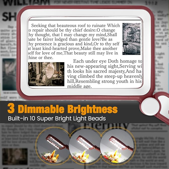 - Comfortable, Adjustable Lighting: Equipped with 10 ultra-bright LEDs and 3 adjustable brightness levels, the magnifier with light ensures comfortable reading even in low-light conditions. The touch switch makes it easy to adjust the brightness, making it ideal for long reading sessions while reducing eye strain