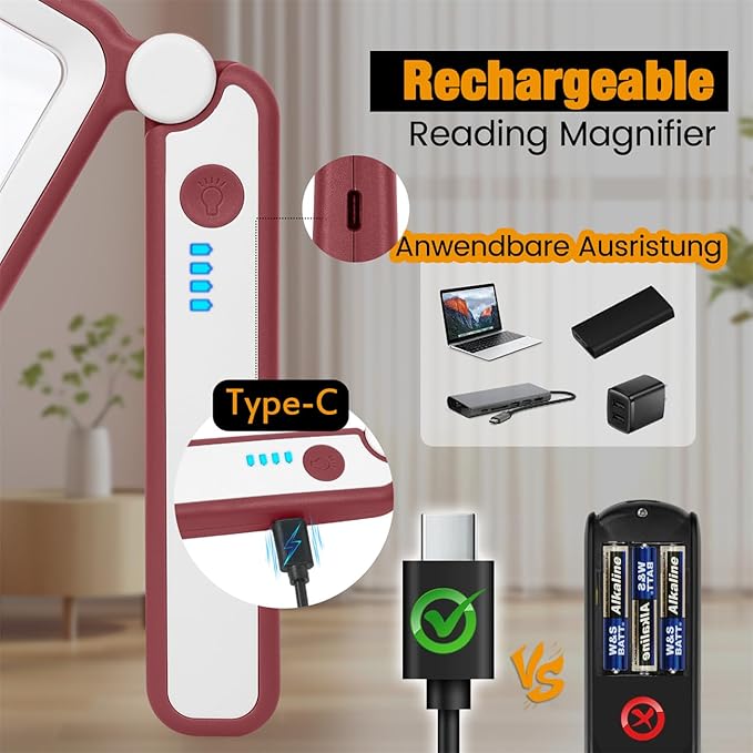- Rechargeable and Convenient: Tobegiga handheld magnifying glass features a rechargeable design with a Type-C charging port, eliminating the need for disposable batteries. Just charge it regularly for uninterrupted use, whether at home or on the go