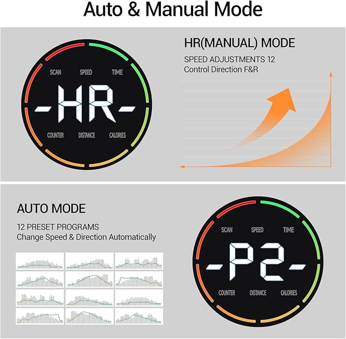 - Auto & HR Modes: This leg exerciser offers both manual and automatic modes. Manual mode lets you customize time (15-30 min), speed (1-12), and direction (forward or reverse). In auto mode that system programmed, speed changes every minute and direction changes every three minutes for a dynamic workout that targets different muscle groups through forward and backward motion