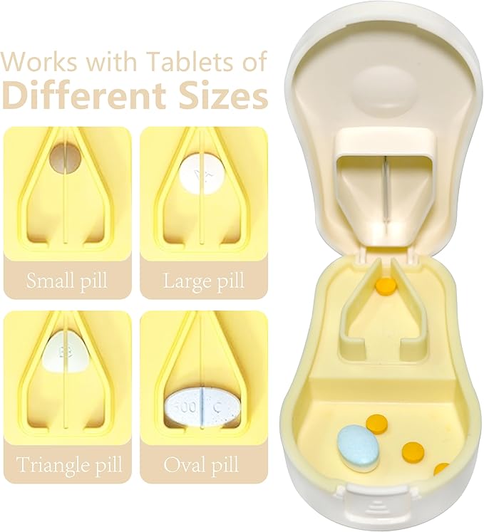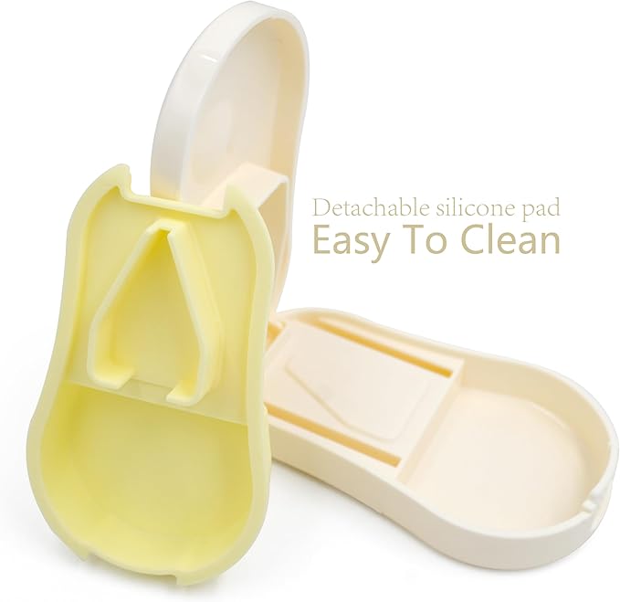 - 【Double as a Pill Box】The food grade material pill cutter has 2 built-in storage spaces, one push on the back to store pills, and the internal cutting one-piece space can also store pills. Compact, portable and well sealed. It is an all-in-one pill cutter and pill case, great for taking on the go!