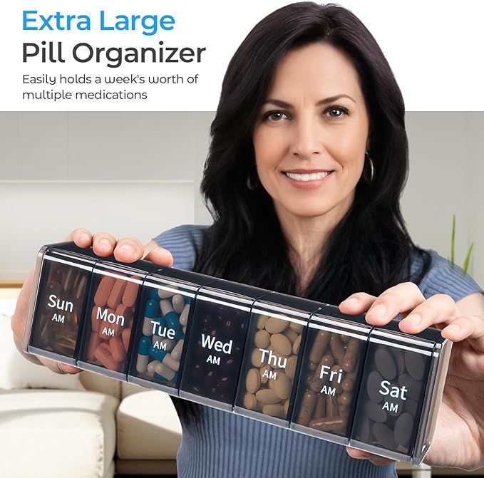 - 【60% More Space than Other Organizers】Still worried about the capacity? With 14 large compartments, this XXL 7 day pill organizer holds up to 3x more pills than standard AM/PM organizers. One compartment easily stores 20 fish oil and 40 multivitamin capsules