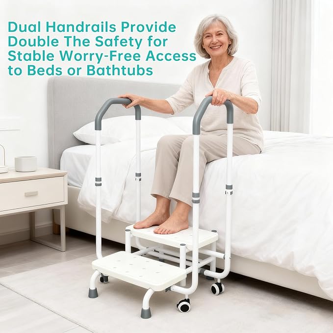 2-Step Stool with Double-Side Handrails & 4 Casters for Elderly, Bed Steps for High Beds for Adults, Non Slip Platform and Adjustable Handrail, for Kitchen Bathroom RV Bathtub, Assist Rail gray