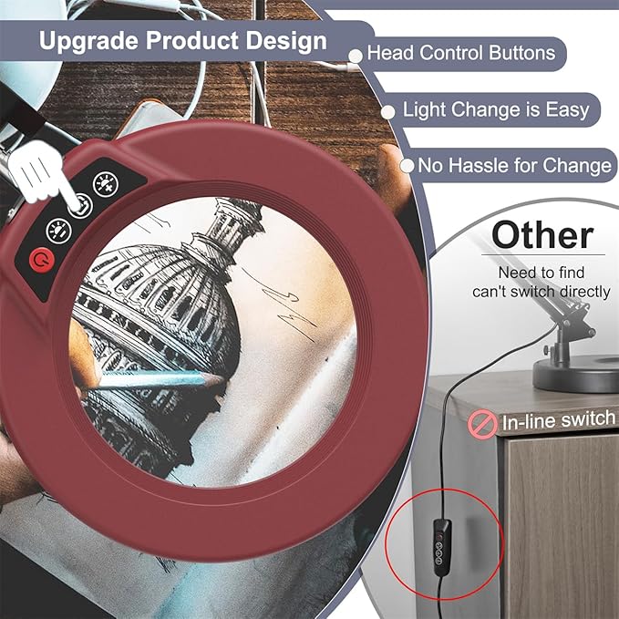 - Upgrade the head button: Easy to operate the head button, avoiding the trouble of reaching behind the table to find the small switch. Unlike the magnifying lamp with a switch on the power cord. The head switch provides more convenience for your use. Ideal for painting miniatures, repairing small electronics, diamond painting, paint by numbers, and other close work.