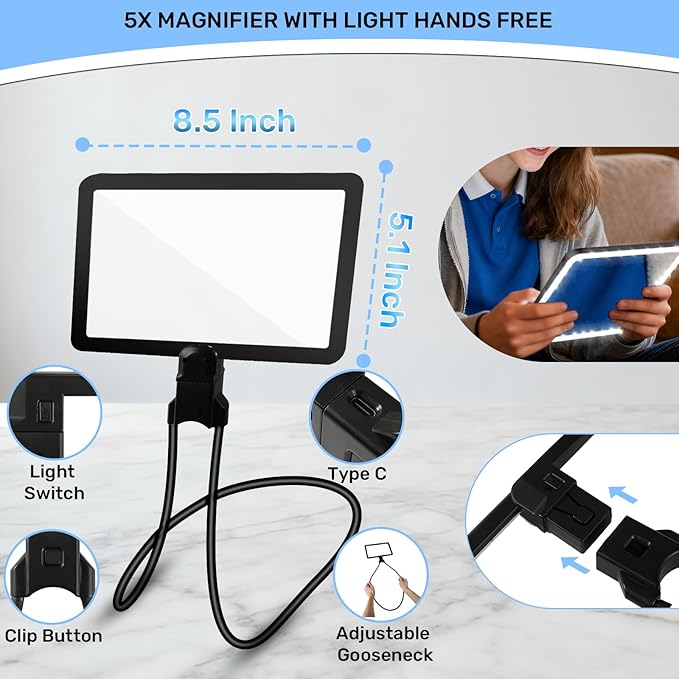 - Large Hands-Free Page Magnifier: Enjoy effortless reading with our ultra-large magnifying area measuring 8.5 x 5.1 inches—designed to cover more text at once so you can read smoothly without constantly moving the magnifier. Perfect for books, newspapers, maps, and more!