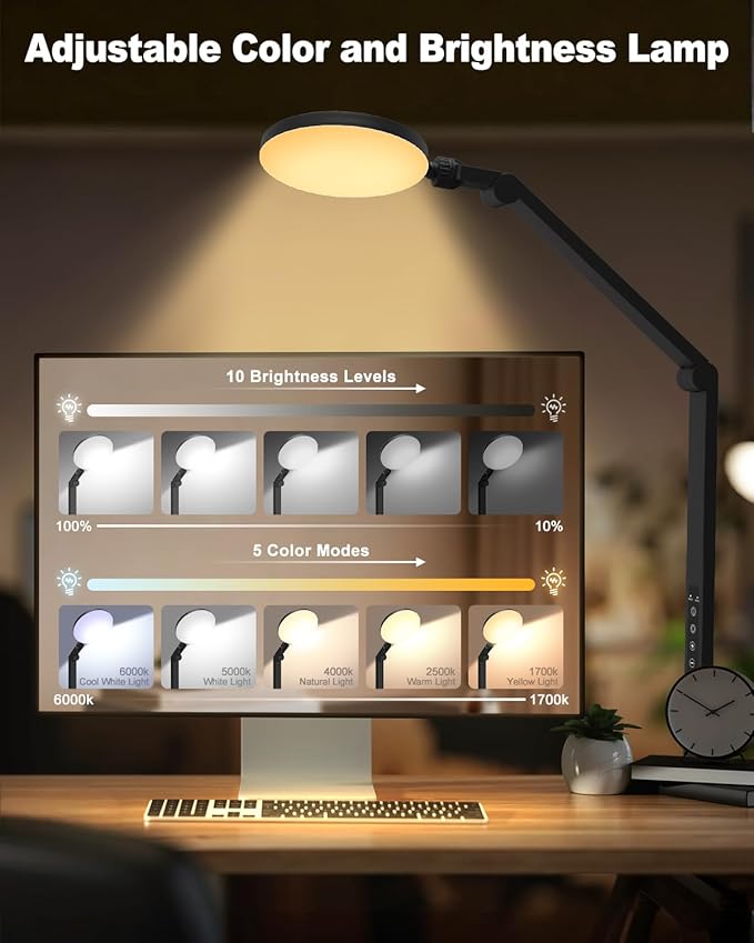 - 【5 Color Modes & 10 Brightness Levels】 – This dimmable reading lamp offers 5 color temperatures (1700K–6000K) — from warm amber night light to cool daylight — with 10 adjustable brightness levels to fit any mood or activity. Easily create the perfect lighting for studying, working, gaming, or relaxing, while the eye protection desk light design helps reduce glare and eye strain during extended use.