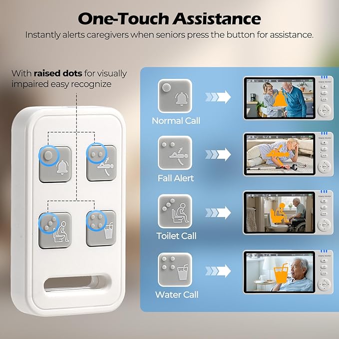 - One-Press SOS & Call Buttons: Dedicated tactile buttons (SOS, Help, Toilet, Fall, Water) send distinct alarms to caregivers. Ergonomic remote with raised markers for visually impaired users.