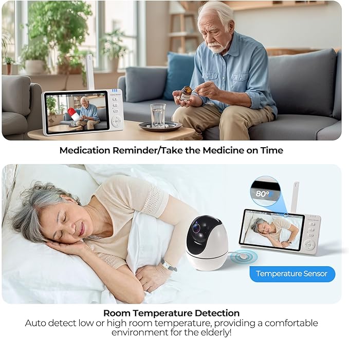 - Medication Reminders & Temperature Monitoring. Programmable alerts ensure timely medication. Temperature sensor monitors room conditions 24/7—alerts caregivers if outside preset range to prevent health risks.