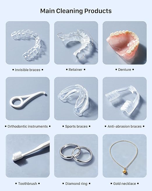 - 【Professional Dental Appliance Care】 Stop scrubbing and start sparkling! Our ultrasonic cleaner uses 45,000Hz high-frequency waves to create millions of micro-bubbles that gently penetrate every crevice, lifting away residue and stains. Keep retainers, aligners, dentures, mouthguards, toothbrushes, and jewelry looking and feeling like new—effortlessly and thoroughly.