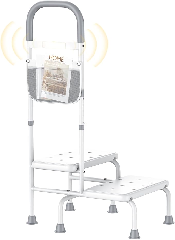 2 Step Stool with Handle for Elderly Heavy Duty Bed Steps for High Beds for Adults Two Step Stools for Seniors with Adjustable Handrail Non-Skid Platform LED Light Foot Stool for Kitchen Room (White)