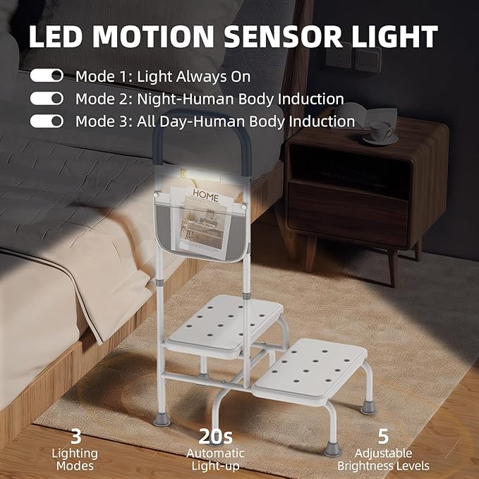 - 【Night Safety Led Sensor Light & Storage Bag】The two step stool provide rechargeable LED sensor lights to prevent dangerous falls at night. When people move, the LED light will sense and automatically activate the light for 25s to increase the safety of getting up at night. The 2 step stool also come with a net pocket storage bag to provide convenient storage for your bedside items.