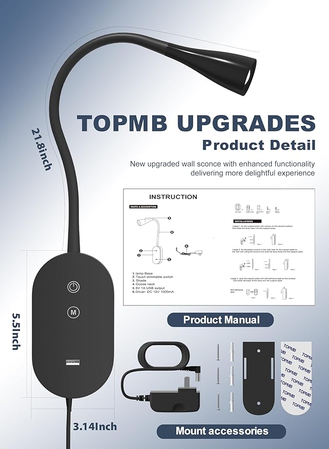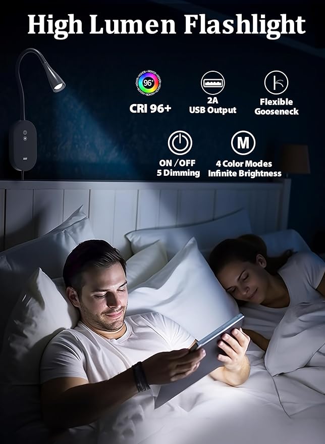 - 【Focused and 360° Gooseneck Lighting– No Glare on Your Partner】Flexible 360° rotation let you aim light exactly where you need it, without disturbing others. Perfect wall mounted reading lamp for shared bedrooms.