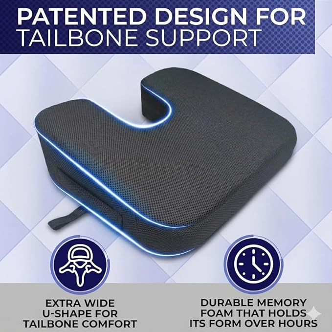 - [STRONG AND COMFORTABLE] - The Yogi Bum Cushions’ coccyx cushion for tailbone pain features sturdy design, crafted from 4" thick high density memory foam that maintains its shape; This tailbone pain relief or haemorrhoids relief cushion is designed to support people with heavier frames; When you need comfortable butt pillows for sitting or tailbone support, trust only Yogi Bum Cushions. Experience ultimate comfort with our pressure relief seat cushion, perfect for extended periods of sitting.