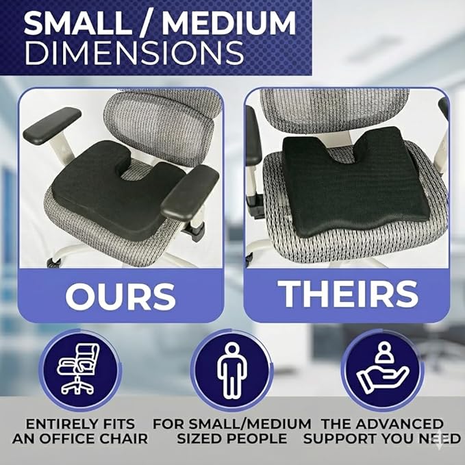 - [HELPS RELIEVE DISCOMFORT] - For Small & Medium sized individuals, this seat cushion with 4" of thick soft memory foam (small dimensions: 14"L x 17"W x 4"H) for tailbone pain relief from Yogi Bum Cushions has been engineered to help quickly; The secret to our pressure relief seat cushion is the extra large U shaped cutout (150% bigger in small vs competition) to alleviate sciatica pain relief, coccyx relief, lower back relief; Unlike a regular memory foam seat cushion, our clever patented design allows plenty of space to sit normally, directing pressure away from tailbone to accelerate recovery & serve as a desk chair cushion for long sitting