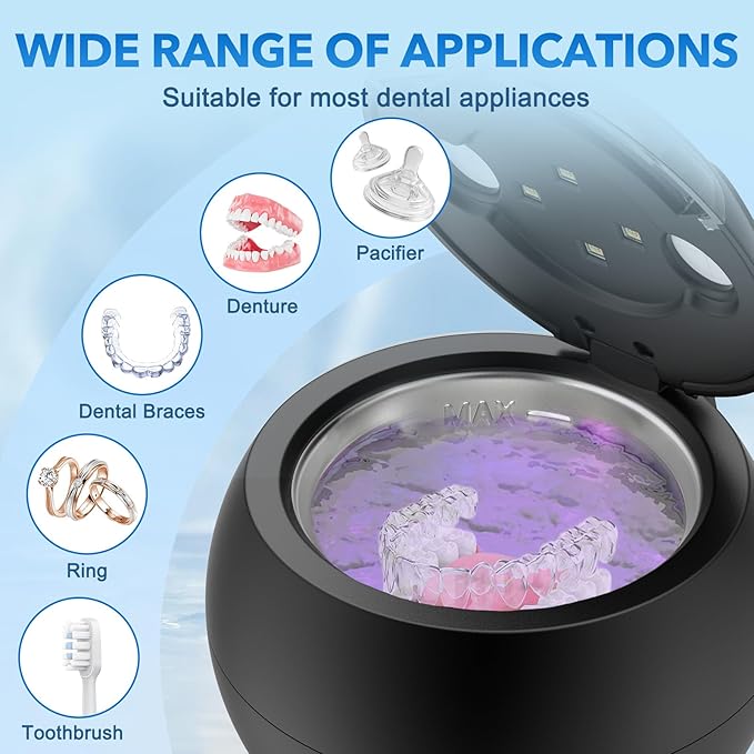 - 【Professional Ultrasonic Cleaning Technology】Our ultrasonic cleaner uses 48kHz high frequency sound waves to generate millions of micro-bubbles that remove stains and odors from retainers, dentures, braces and jewelry. Gentle on fragile items, powerful on dirt - great for everyday use. Always use cold water for better cleaning results