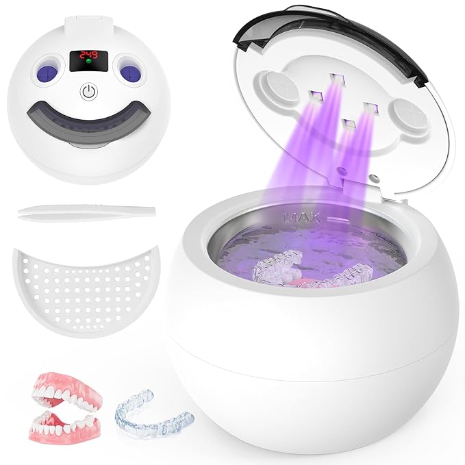 - 【4 Efficient Cleaning Modes】The ultrasonic cleaner has 4 modes to choose from: I. 5 mins ultrasonic cleaning with UV light; II. 10 mins pulse cleaning with UV light; Ⅲ. 10 mins for only ultrasonic cleaning; Ⅳ. 10 mins for only UV light working. Customize your cleaning plan based on your denture and dental appliance needs