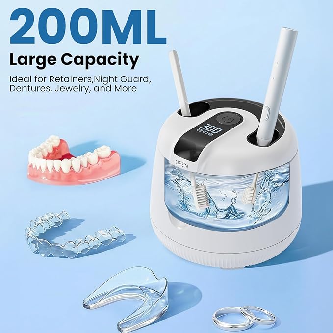 - Large 200 mL Capacity & Sleek Design: The ultrasonic cleaner stainless steel tank holds most retainers, night guards, dentures, aligner or jewelry; Compact and stylish build fits on bathroom counters or travel bags