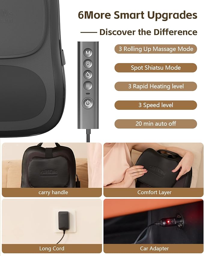 - [Back Massager with Heat]– Designed with 3 rapid heating levels (113°F, 122°F, 131°F), this feature adds gentle warmth that complements the massage and helps you unwind faster after long hours at the office or home