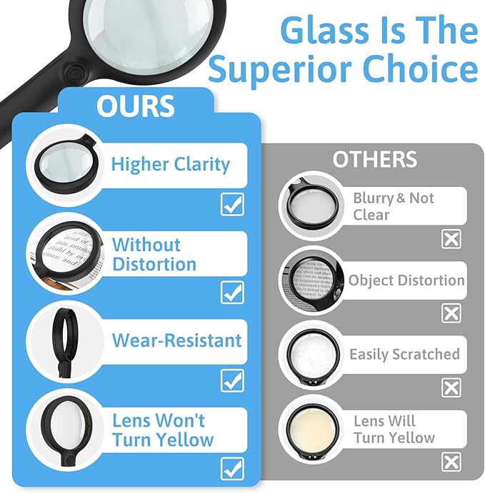 - Shatterproof Lens, Super Clear Vision: Experience crystal-clear magnification! This magnifying glass features a premium, shatterproof glass lens that provides a distortion-free view, protecting your eyes from strain. Perfect for reading fine print in books, maps, and documents, ensuring every detail is sharp and easy to see