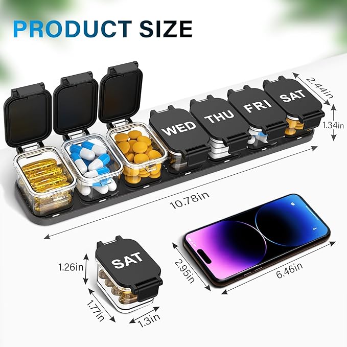 - 【Extra-Large Capacity】This extra large weekly pill organizer includes 7 spacious detachable compartments that hold a full week of vitamins, supplements, or medications, with each compartment fitting up to 12 fish oil capsules. Each pill box offers jumbo pill organizer space for pill storage and also acts as an XXL pill organizer to keep you organized