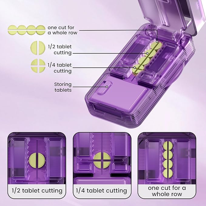 - 【Accurate 1/4 & 1/2 Cutting】Cut multiple pills into halves or quarters in one press, no realignment needed; Saves 50% time vs. single-cut