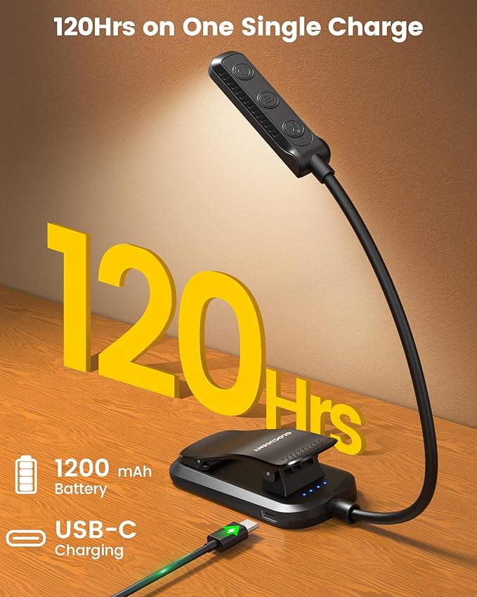 - [120H Longer Battery Life & Rechargeable] Equipped with a durable 1200mAh rechargeable battery, this reading lights for books in bed offers up to 120 hours of illumination on a single charge, capable of an impressive 8 months of daily 30-minute reading. Convenient USB-C charging and four clear battery indicators make it easy to check the battery level at a glance.