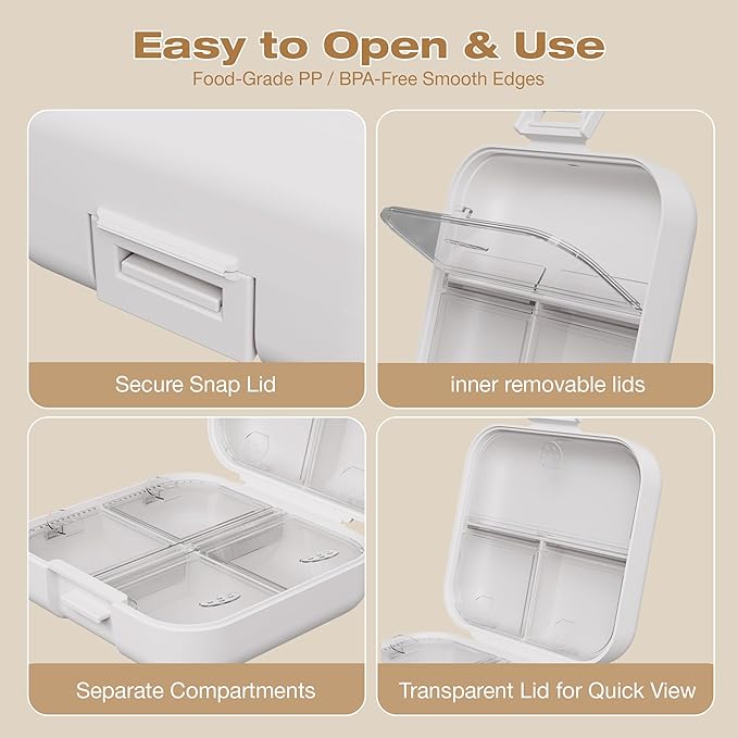 - Secure Snap Closure & Moisture-Resistant Shell: Made of durable, food-grade PP plastic with a tight snap clasp. Keeps pills safe from accidental spills, dust, or dampness, maintaining freshness and potency