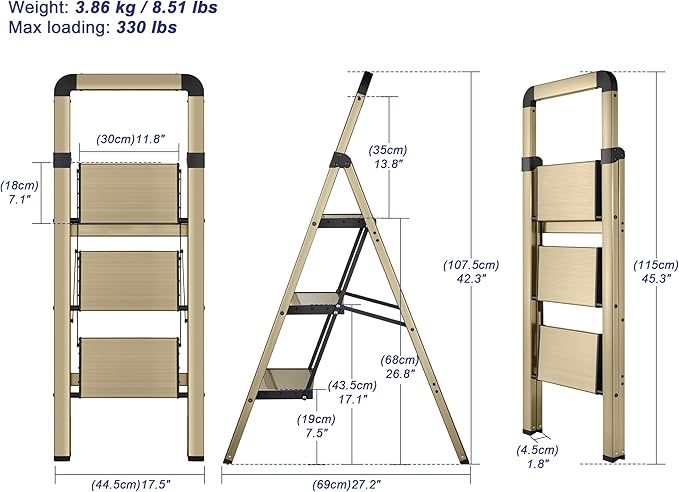 - 1.【LADDER'S SIZE】 - Open Dimensions: 27.2"L × 17.5"W × 42.3"H, Folded: 45.3"L × 17.5"W × 1.8"H; Maximum load: 330 lbs. This step ladder comes fully assembled, and the modern Champagne gold finish design is ideal for blending with your home's decoration.