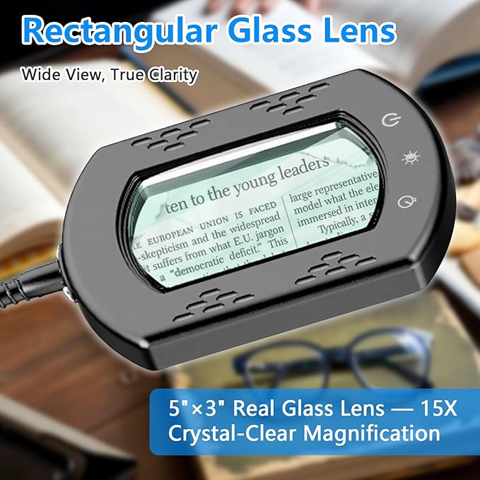 - 15X Reading Magnifying Glass: This desktop magnifying lamp is equipped with a 5" x 3 "rectangular glass lens with amazing clarity and 15x magnification. The 15x Lighted Magnifying Glass Hands Free is very suitable for jewelry making, electronic maintenance or small printing, knitting, nail art, etc. Its large lens can minimize edge deformation, so you can get a broad and clear field of vision to complete larger tasks