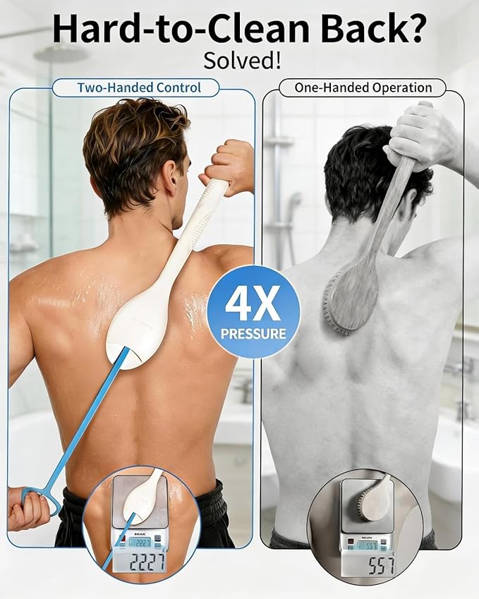 - ✅【Innovative 1-Second Extension to 31.9" 】Unfold and transform your shower routine! The unique pull-ring instantly extends your reach, allowing a double-handed grip that generates 4x the scrubbing power of ordinary shower brushes for a truly satisfying, deep-pore clean.