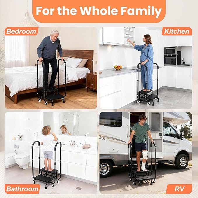 - 【Upgraded Dual Handle Design for Easy Movement】:This step stool with handle is specifically designed for the elderly, offering dual-side support to enhance balance and stability. With four lockable 360° swivel wheels, it allows for effortless movement and secure locking when needed. Say goodbye to traditional heavy bed stools and enjoy easy, safe, and convenient access to every corner!