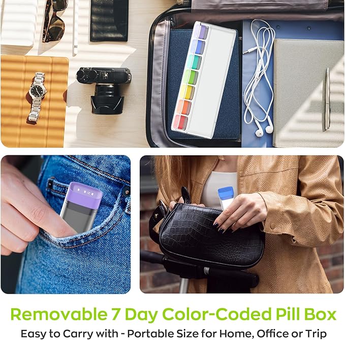 - PORTABLE AND DETACHABLE: The detachable pill organizer makes on-the-go use effortless. Each day's pill holders fits securely in a sleek black case, keeping your medication organized and spill-free. In a rush? Just grab a day's supply and slip it into your purse, pocket, or lunch bag. The square-bottom design ensures stability and smooth dispensing, so pills won't get stuck. Excellent for individual days and traveling