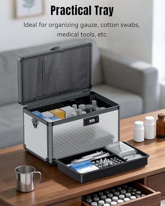 - Robust Construction: Made of strong aluminum alloy with HDF interlayer, the medicine lock box is waterproof and highly resistant to corrosion and impact. The 4 metal-clad corners on the bottom are reinforced for added sturdiness