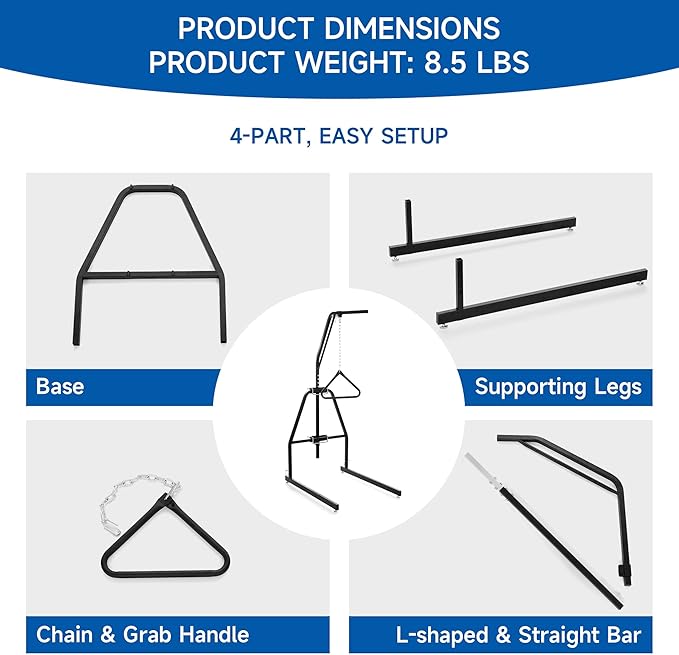 - Easy Installation: Trapeze bar for bed mobility floor stand consists of 4 parts - base, left & right foot, chain & grab handle, L & straight bar. Easy to assemble and move around
