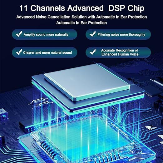 - 11 Channels Advanced DSP Chips:The More Channals ,The More Advanced .This Advanced DSP Chips Offer Perfect Noise Cancellation Solution with Automatic In Ear Protection.Amplify sound more naturally,Filtering noise more thoroughly,Clearer and more natural sound,Accurate Recognition of Enhanced Human Voice.