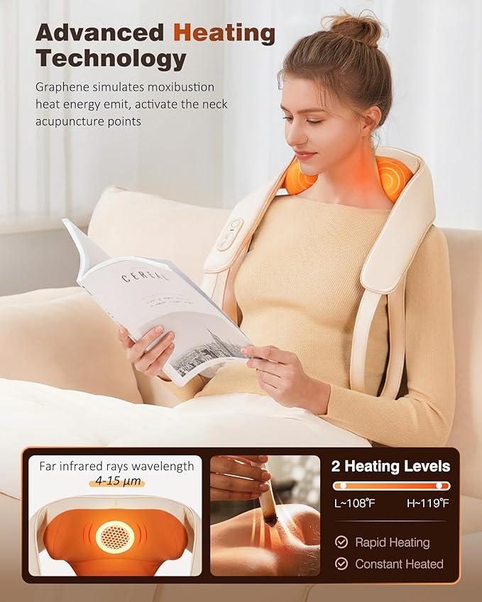 Neck and Shoulder Massager with Heat, Cordless Back and Neck Massager, Upgraded Graphene Heating, 4D Shiatsu Deep Kneading Massage for Shoulder, Back Pain Relief, Gifts for Dad Mom Friend (Beige)