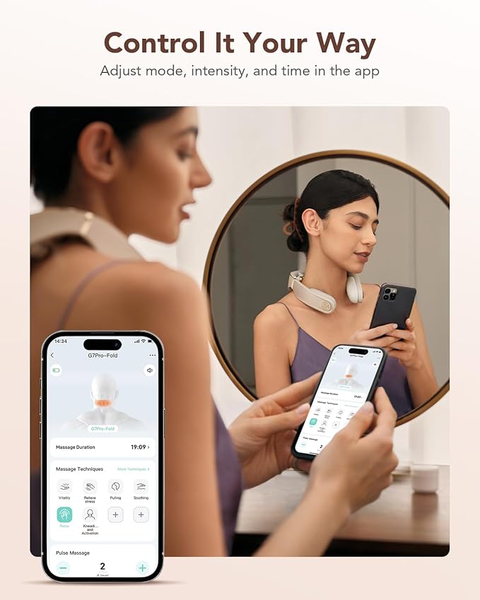 - Smart App Control &Multi Modes– Enhanced program up to 7kHz and expanded to 11 total modes (5 on-device + 6 in-app), including an app-exclusive “Dopamine Tech” mode. The neck massager comes with a 2400mAh battery which support 140 min use.App: search “Future Wear” on iOS, or scan the QR code on Android to download
